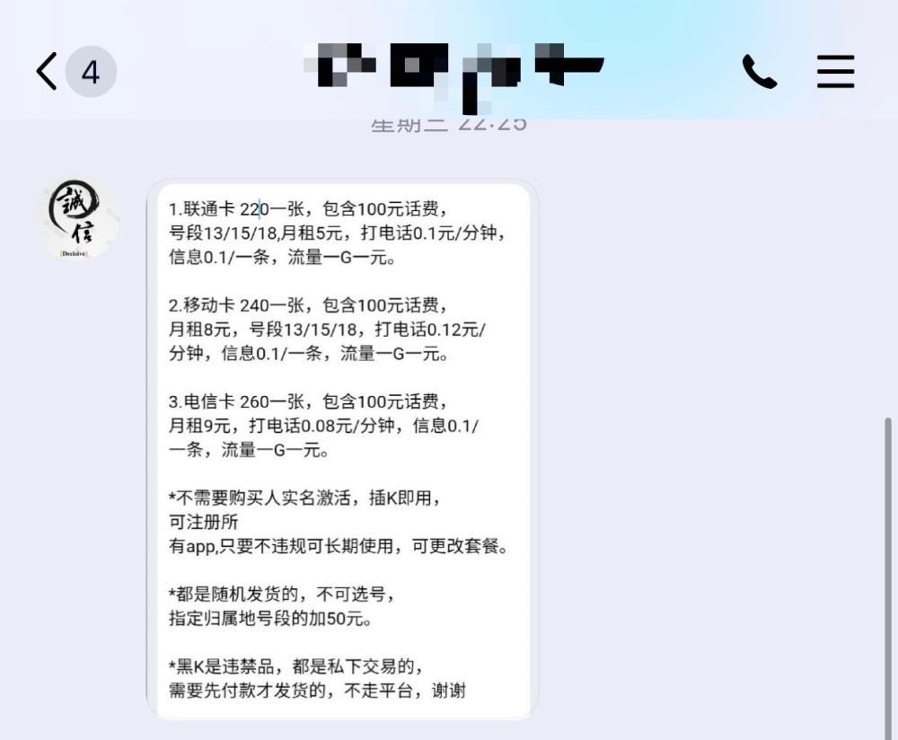 说明目的后,对方发来一张“价目表”,三大运营商电话卡每张收费220元至260元不等,包含100元话费,并特别标注“不需要购买人实名激活,插卡即用,可注册所有App,只要不违规可长期使用,随机发货。黑卡属于违禁品,都是私下交易,需要先付款才发货,不走平台。”