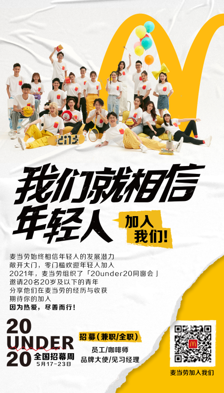 为支持年轻人发展,麦当劳将于近期推出“麦行中国”项目,面向员工招募青年精英,通过多层次的职业规划、能力建设、服务社区等活动,帮助参与者开阔视野、提升综合素质。