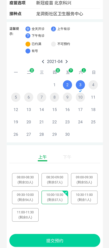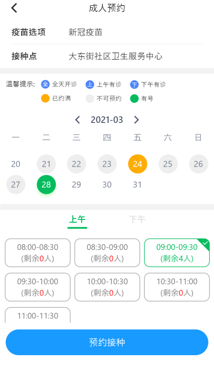 选择社区医院,并选择相应的时间段进行预约;