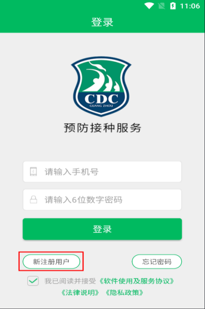 打开“预防接种服务”APP,在登录界面点击“新注册用户”进行注册。