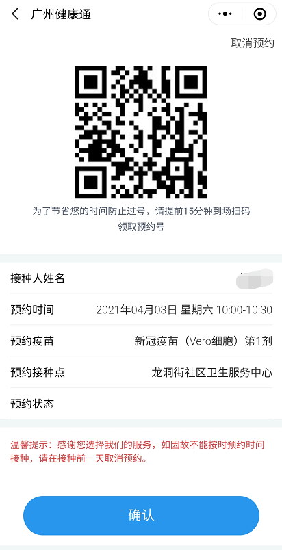 3、若不能按时前往接种,请提前一天取消。APP设有爽约机制,爽约3次锁定一个月后才能重新预约。