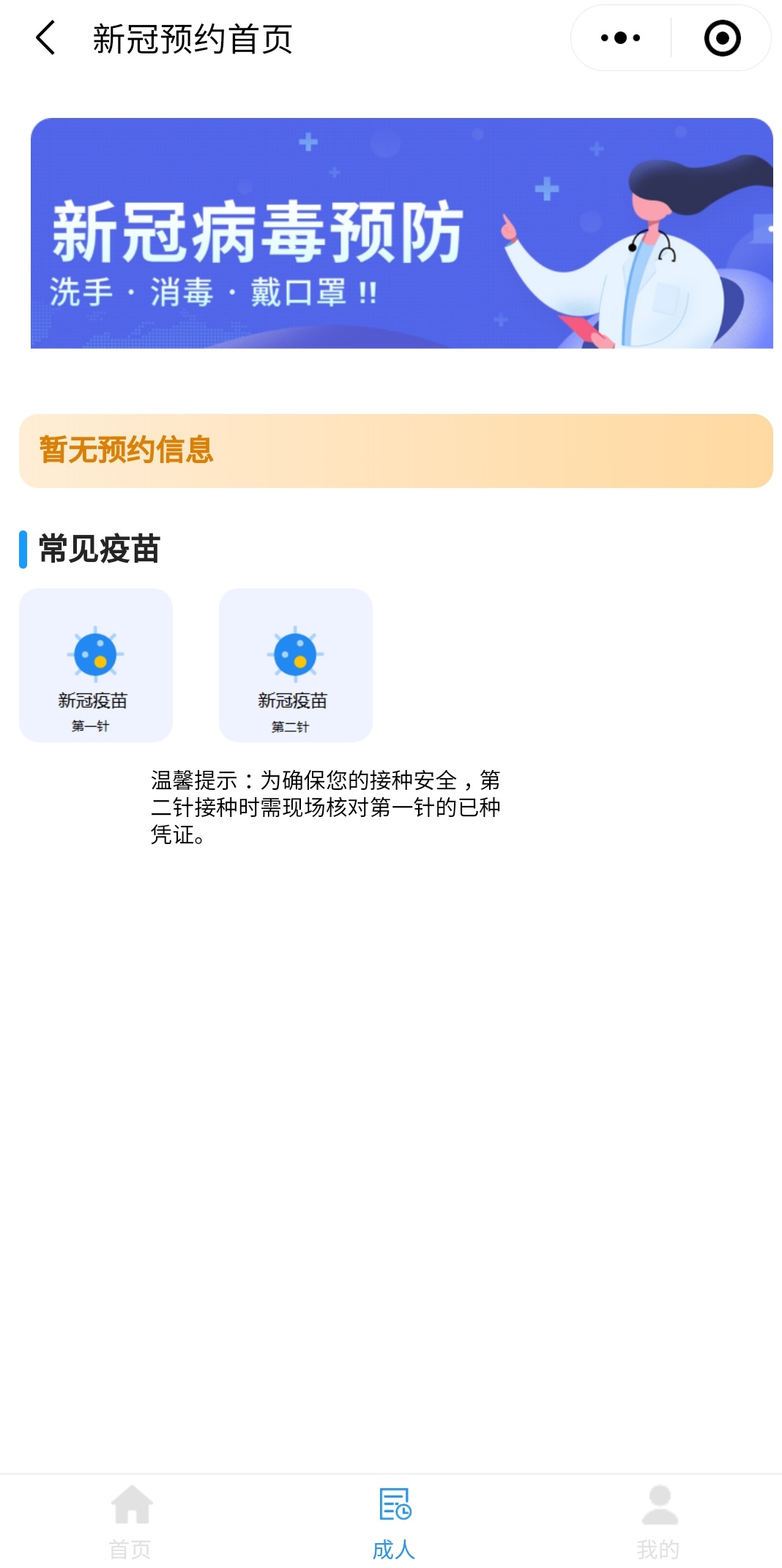 进入首页,点击“新冠疫苗预约”,进入新冠疫苗预约界面。