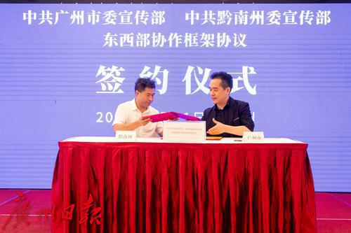 推荐会上,中共广州市委宣传部与中共黔南州委宣传部签署了“十四五”期间协作帮扶框架协议。此前,黔南州文化产业考察团还来到了广州市长隆集团和欢聚集团,就黔南州旅游文化产业展开了交流座谈,并与欢聚集团就马尾绣、蜡染等非遗产品直播培训达成了下一步的合作意向。
