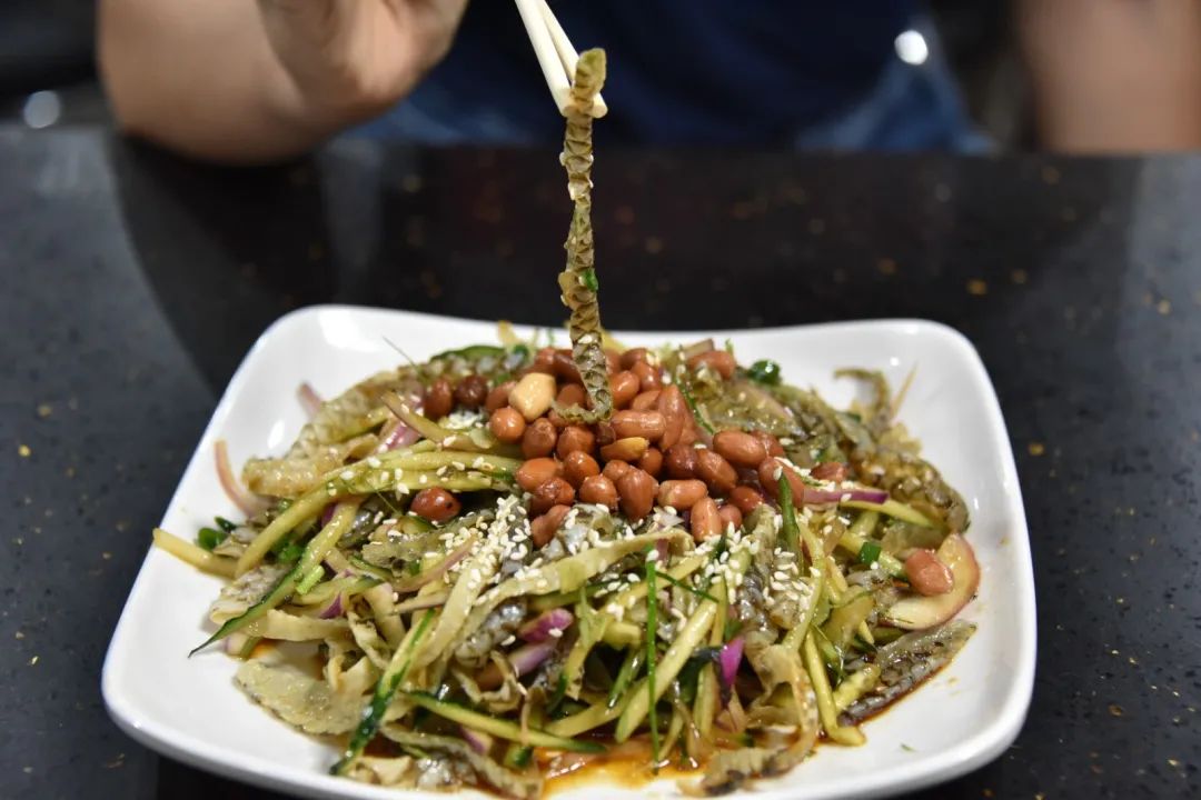 这里凉拌鱼皮的配料有青瓜丝、洋葱丝、香菜、葱、花生、芝麻,而让味道提升一个层次的点睛之笔则是柠檬叶,随后添加酱油、秘制调料、香油等,一分钟内搅拌均匀至色泽油光即可上桌。许美红介绍,他们选用的是皖鱼皮,这样凉拌出来的鱼皮酸辣爽口、口感层次丰富,老少咸宜,而柠檬叶清新的香味让人越吃越想吃。