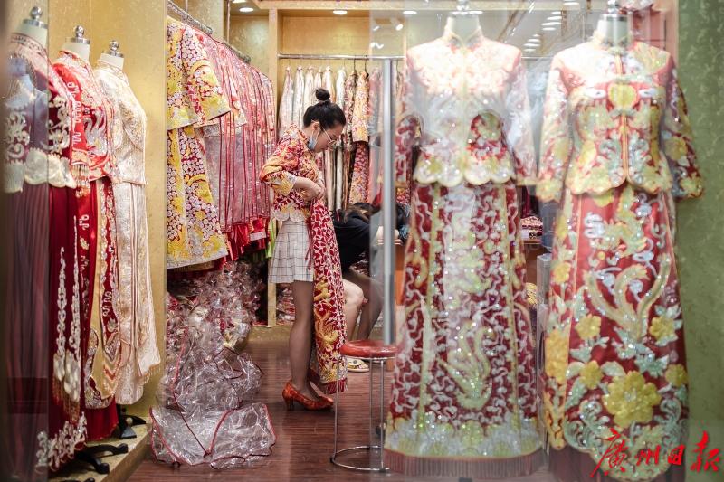 据2020年发布的《中国婚庆产业市场研究与投资预测分析报告》显示,国内已形成广州婚纱街、虎丘婚纱礼服市场两大婚纱批发集散地,占国内市场份额约70%。今年广州提出发展“甜蜜经济”,探索“婚庆+旅游”发展新模式。在“5·20”前,记者走进闻名海内外的广州婚纱街,探寻婚纱街“甜蜜经济”再升级。