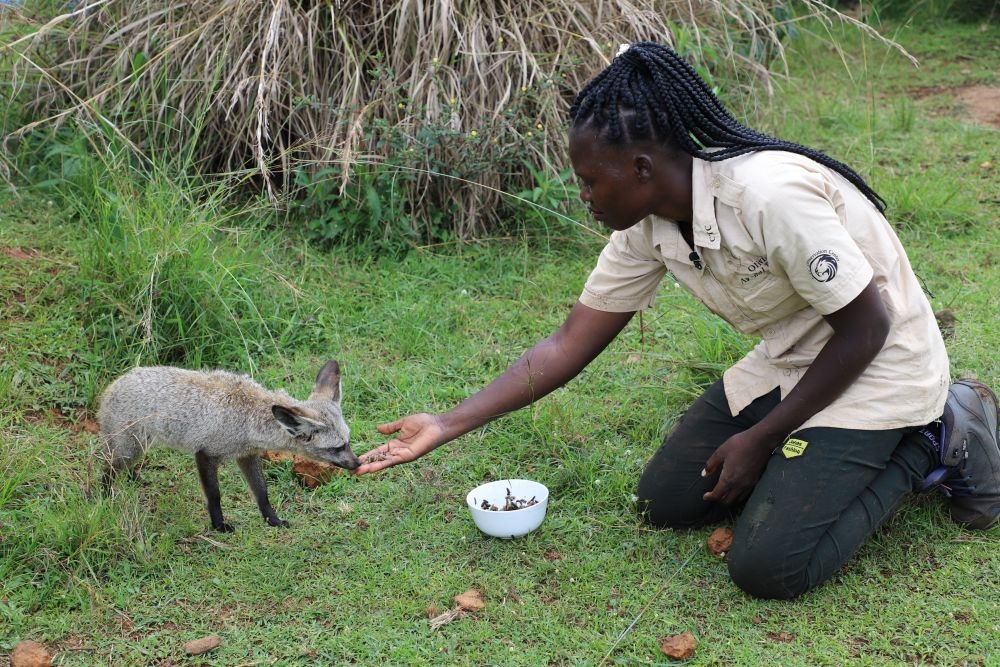 霍莉·奥利维亚·阿凯洛在乌干达布坦巴拉区的CTC野生动物保护中心给一只大耳狐喂食。新华社记者 张改萍 摄