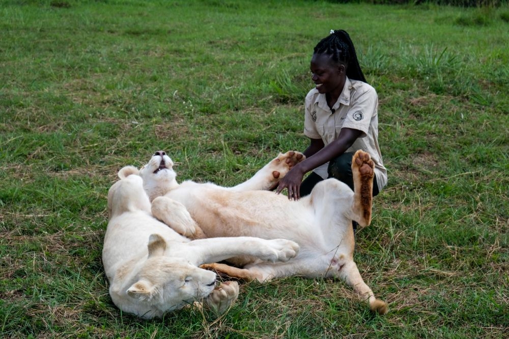 霍莉·奥利维亚·阿凯洛在乌干达布坦巴拉区的CTC野生动物保护中心与狮子互动。新华社发(阿佳拉·纳瓦达 摄)
