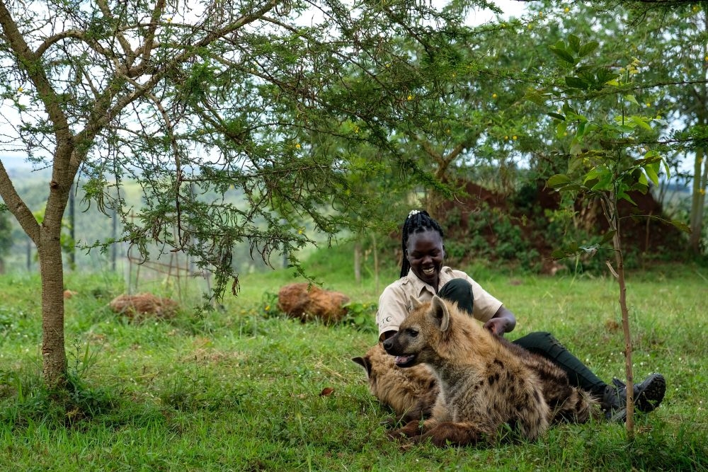 霍莉·奥利维亚·阿凯洛在乌干达布坦巴拉区的CTC野生动物保护中心与鬣狗互动。新华社发(阿佳拉·纳瓦达 摄)