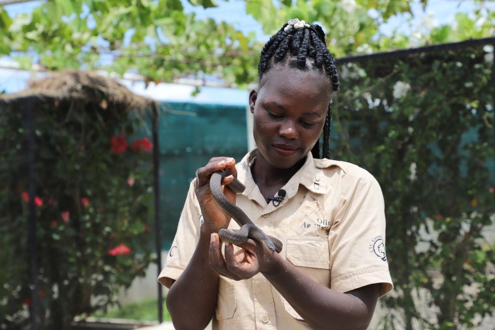 霍莉·奥利维亚·阿凯洛在乌干达布坦巴拉区的CTC野生动物保护中心与一条食蛋蛇玩耍。新华社记者 张改萍 摄