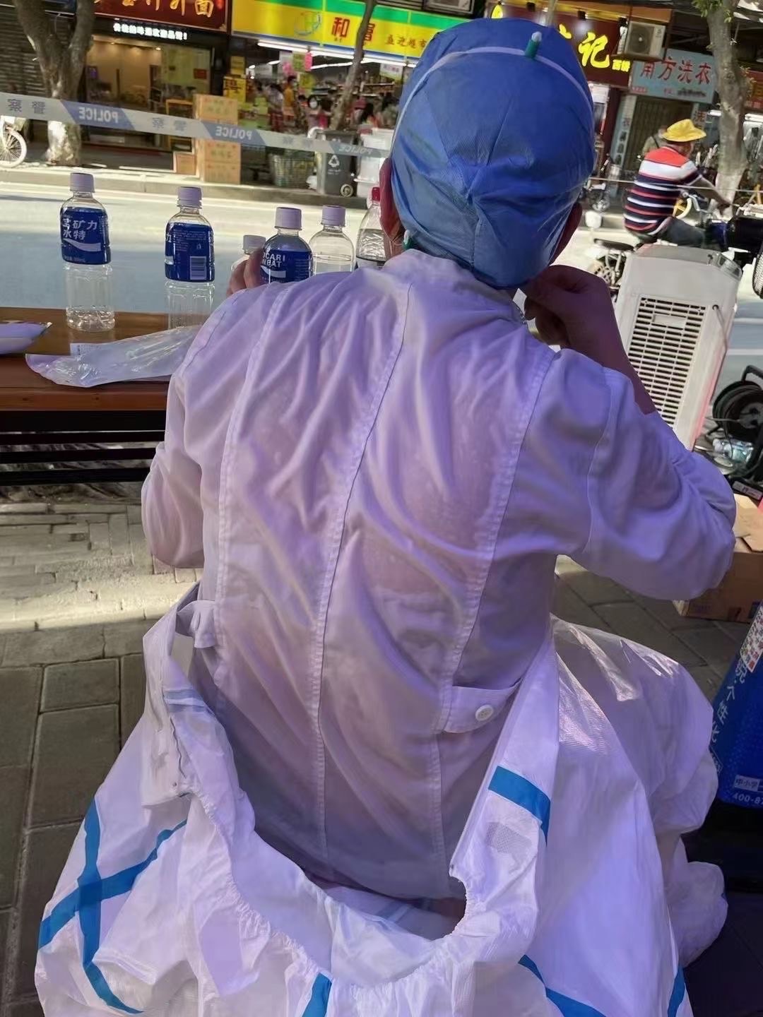 记者电话联系到了背影照的主人公,她是来自荔湾区中心医院神经内科的护士李佩真。电话那头的李佩真声音有些沙哑,她昨天已连续工作约20个小时,休息了几个小时后,正准备返回科室工作岗位。“21日早上7点到科室,收到护士长通知要去支援龙津华府检测点,中午1点多到达检测点开始工作。”李佩真说,一直持续到晚上10点,她才与同事交接。在李佩真回到家、换下湿透了的衣服后,她又接到了上门核酸检测的紧急任务,从22日凌晨1时一直忙碌到清晨。