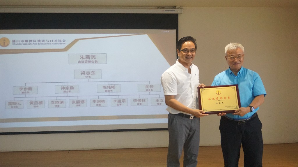 会上,梁志东为朱新民颁发区演讲与口才协会永远荣誉会长牌匾。朱新民总结和回顾了协会的发展历程。他用“初心与使命”“硕果累累”“期望与祝福”三组关键词讲述了协会创立七年多以来的奋斗故事,并寄语协会未来发展更美好。值得一提的是,在区演讲与口才协会的推动下,中国演讲协会、中国演讲协会联盟曾于2015年5月授予佛山市顺德区“中国演讲名城”的荣誉称号。放眼全国县区级城市,顺德获此殊荣实属难得。