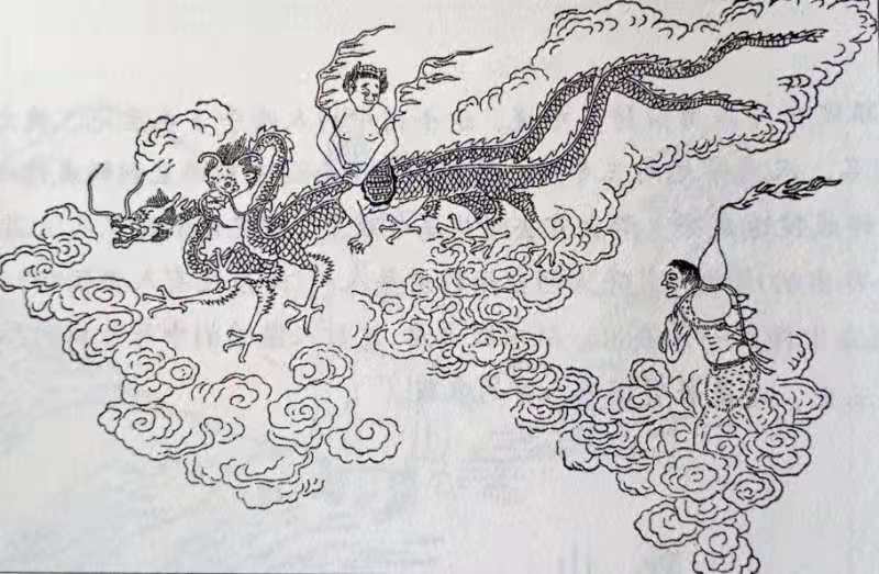《山海经·海外南经》载:“南方祝融,兽身人面,乘两龙。”意思是说祝融是管辖南方的神,他长得兽面人身,常乘两条龙飞行。