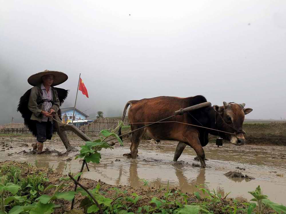 梯田依山势开建,最高处1260米,最低处280米,落差近千米,最高达62个梯层,又有零星村落点缀其间。耕作期里泉水自山顶向下逐层灌溉,气象万千。山下还有农夫在耕作,一条耕牛拉动着犁具奋力向前,后面随即翻卷起一道黝黑的泥浪,空气中弥漫着泥土潮湿的腥香。不远处一位正在小憩的农夫则吹向了竹笛,七个孔吹出了数不清的山高水长。