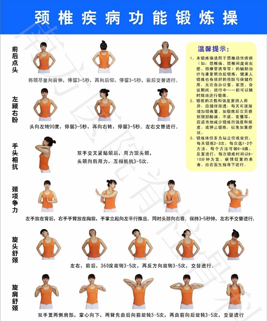 6、 颈部、腰部劳累不舒服的时候做做颈椎、腰椎保健操,这些都可以预防脊柱疾病的发生。