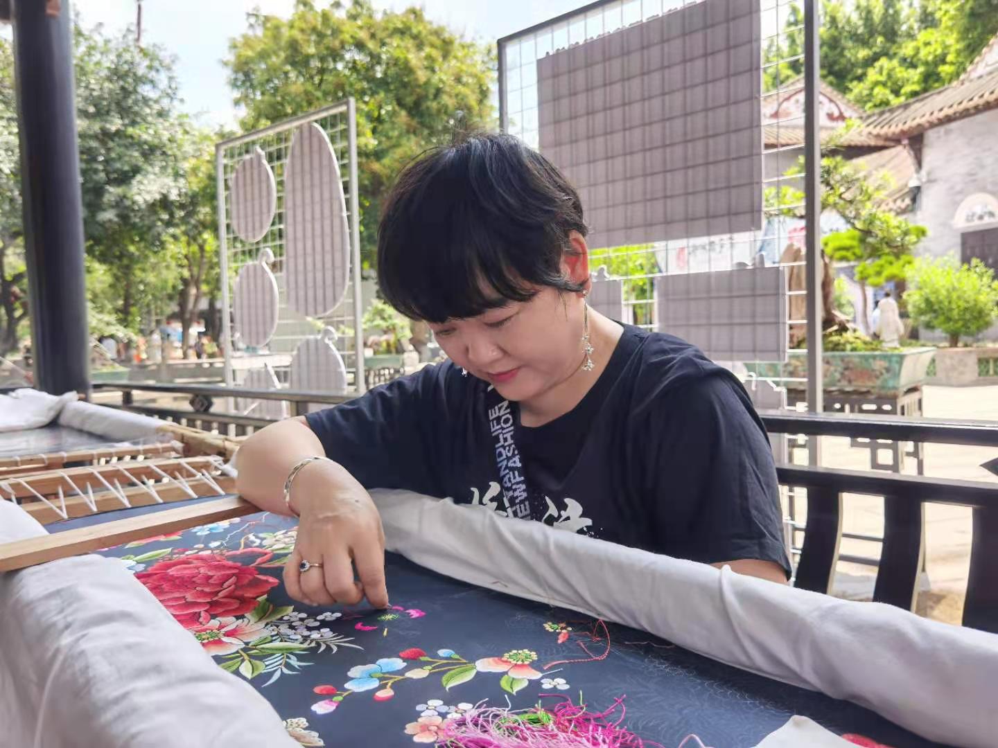 据介绍,摊位对广东非遗文化进行展示,再现民间巧艺。在挂吊了20盏鱼灯的鱼灯摊位长廊上,鱼灯师傅现场展示着鱼灯制作过程。在清晖书院内,广绣传承人现场教授游客制作简单精美的广绣作品。另外,而潮阳剪纸大师则教游客剪出潮汕特色的样式图案。