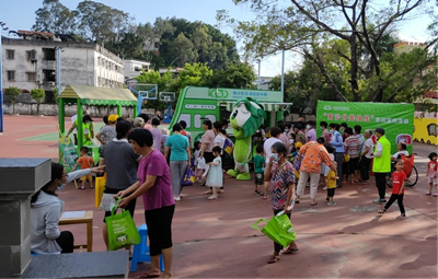 活动现场,南沙人的老朋友——南沙分类大使“小沙”也来到了现场,与参与活动的村(居)民一同参与“垃圾投投乐”、知识宣讲摊位、趣味拍照墙等分类趣味互动环节。不少群众都主动手举“南沙分类我最叻”“送小沙C位出道”等标语手举牌与“小沙”合影,发圈为南沙区的垃圾分类新理念“代言”,让垃圾分类的理念通过线上社交媒体平台传播得更广更远。与此同时,“南沙分类快线”地摊车上的LED屏幕正不断滚动播放着南沙区自主拍摄的垃圾分类宣传片,为参与活动的村(居)民带来了最新的垃圾分类、绿色环保资讯。