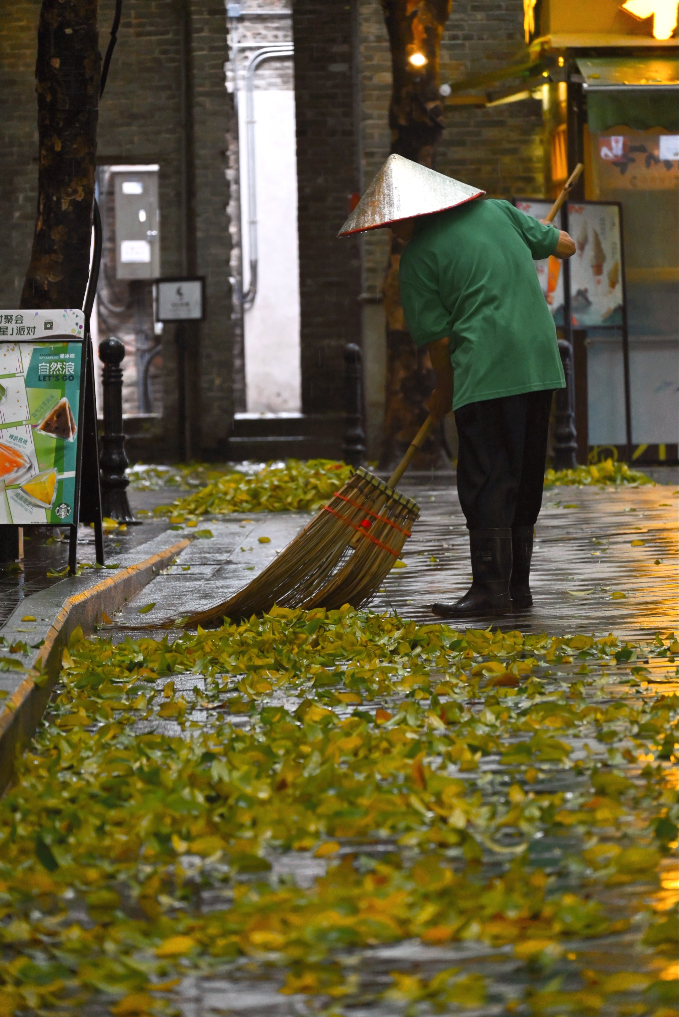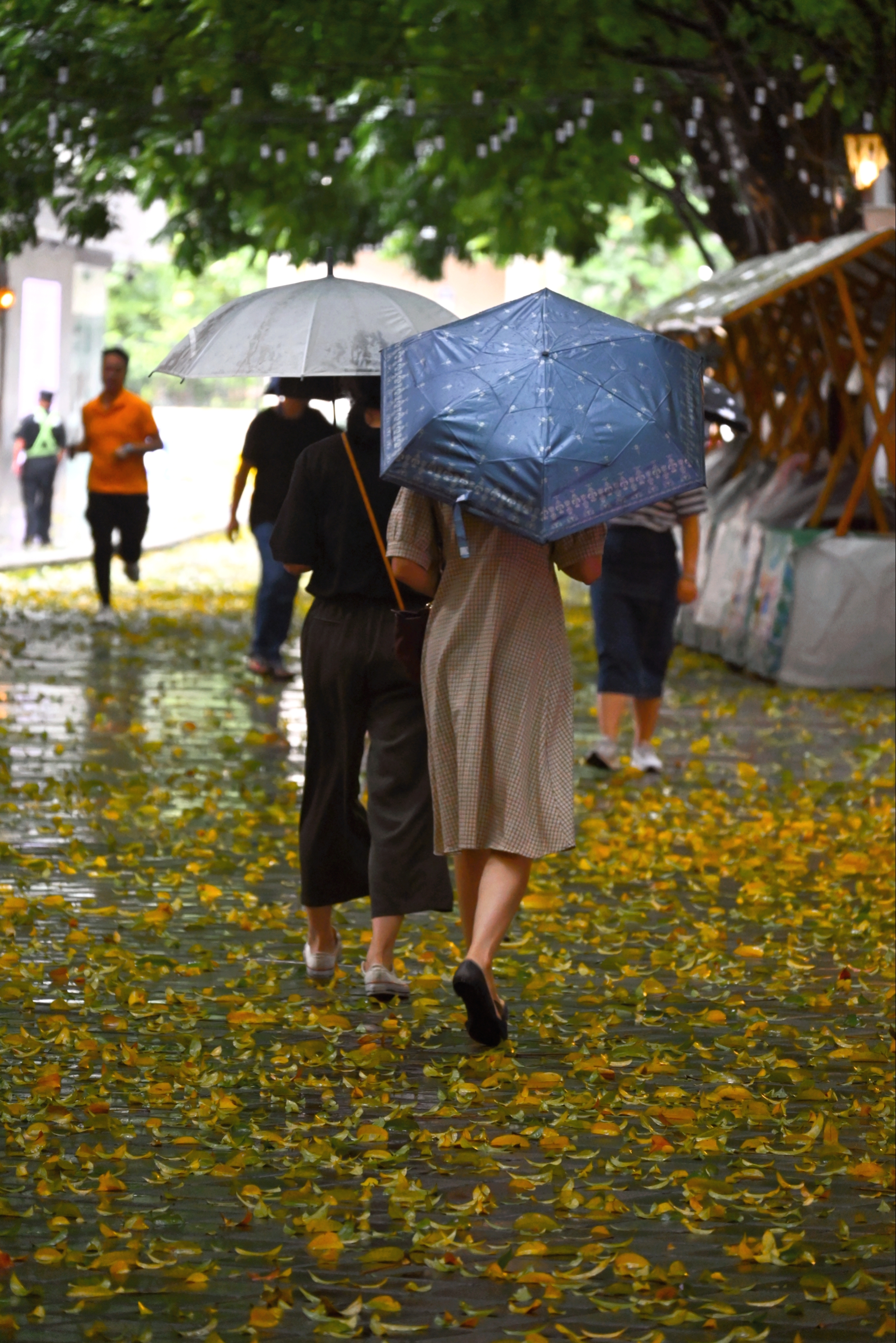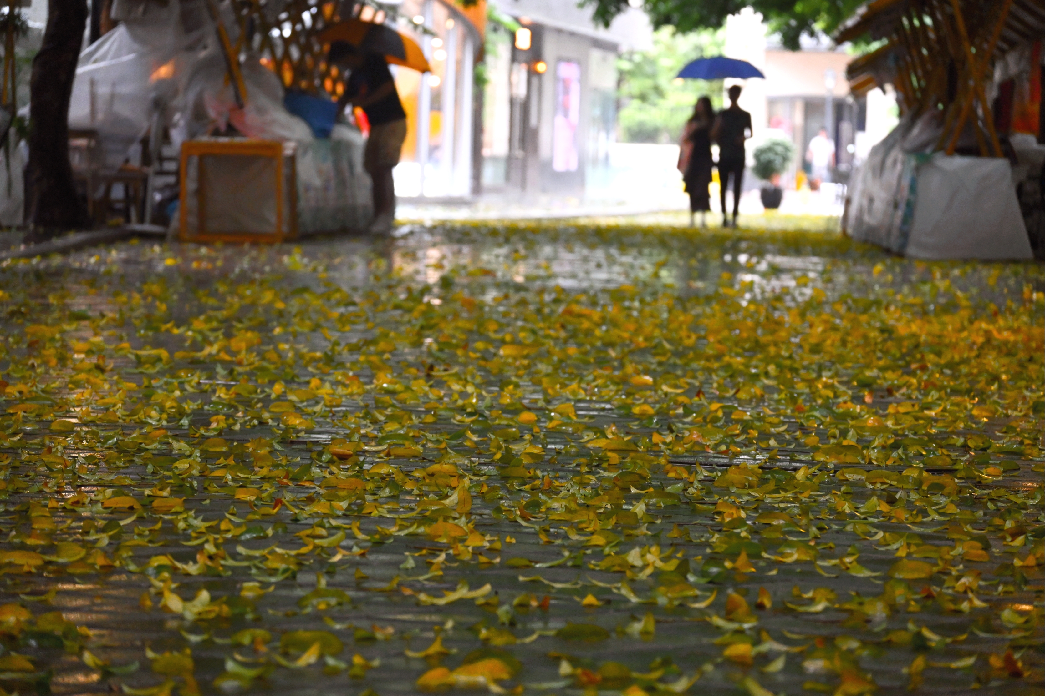 在佛山禅城区祖庙商圈,记者走访时看到,市民在这场雷雨中感受到了不一样的夏天。这里多条街道因为雷雨大风,吹落了大量的落叶,放眼望去满地一片金黄色,好似秋天,给人一种步入秋天的印象。