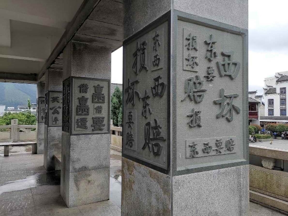 碑亭上有十一根立柱,中间三根,前后八根,中间的三根寓意“三大纪律”,前后八根寓意“八项注意”,每一根立柱上都用不同的字体刻上了《三大纪律·八项注意》的有关内容。
