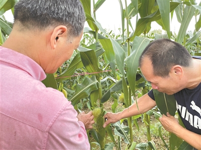 “在幼虫时杀最好,草地贪夜蛾长大后钻到玉米穗里,就没那么容易杀了。”冒着大雨捧起一根玉米棒子,叶伟忠千叮万嘱,李桂福点点头,记下了要领。在技术指导现场,叶伟忠和同事还向农民们派发了特大金银粟甜玉米种子,供不应求。
