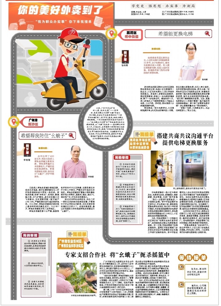 日前,广州市出台《“您的心愿、我的志愿”——党组织、党员为群众办实事“双微”行动工作方案》,发动全市各级党组织和广大党员面向镇(街)、村(社区)基层,积极为群众排忧解难。广州日报推出《你的美好外卖到了——“我为群众办实事”你下单我接单》系列全媒体报道,从“双微”受益者——基层群众的诉求入手,介绍各区、各职能部门党组织重点任务清单的具体工作,展现广州高标准高质量开展党史学习教育的具体行动。本期聚焦市农业农村局、市农业科学研究院、荔湾区市场监管局桥中监管所、长安社区居委会为群众办实事的相关举措。