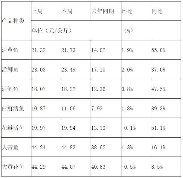 从同比看,除了大带鱼、大黄花鱼,其他鱼种同比均大幅上涨。如,草鱼周平均价格21.73元/公斤,同比上涨55.0%;花鲢鱼周平均价格19.94元/公斤,同比上涨51.1%;鲤鱼周平均价格18.22元/公斤,同比上涨47.5%。