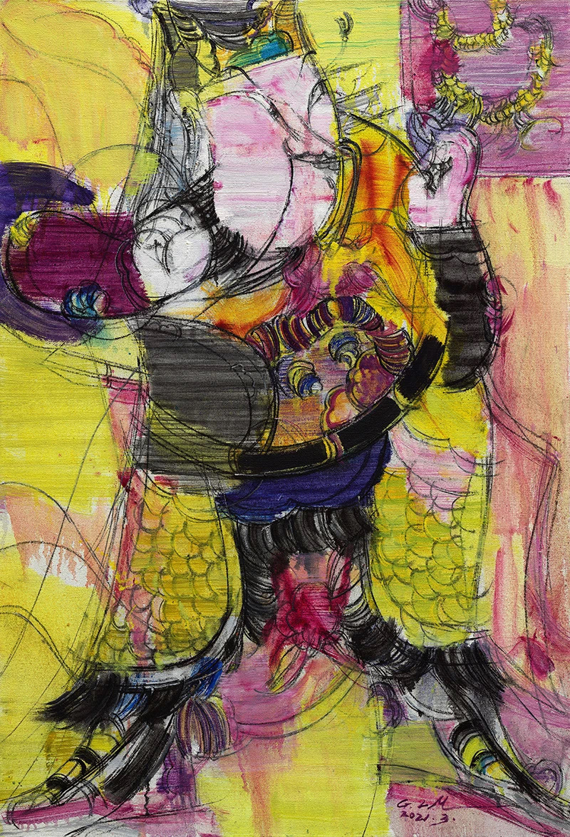 艺术家顾黎明的作品有对楚汉服饰和民间木刻版画等中国传统文化形式的关注与借鉴,门神形象更是传统民间艺术的符号化。