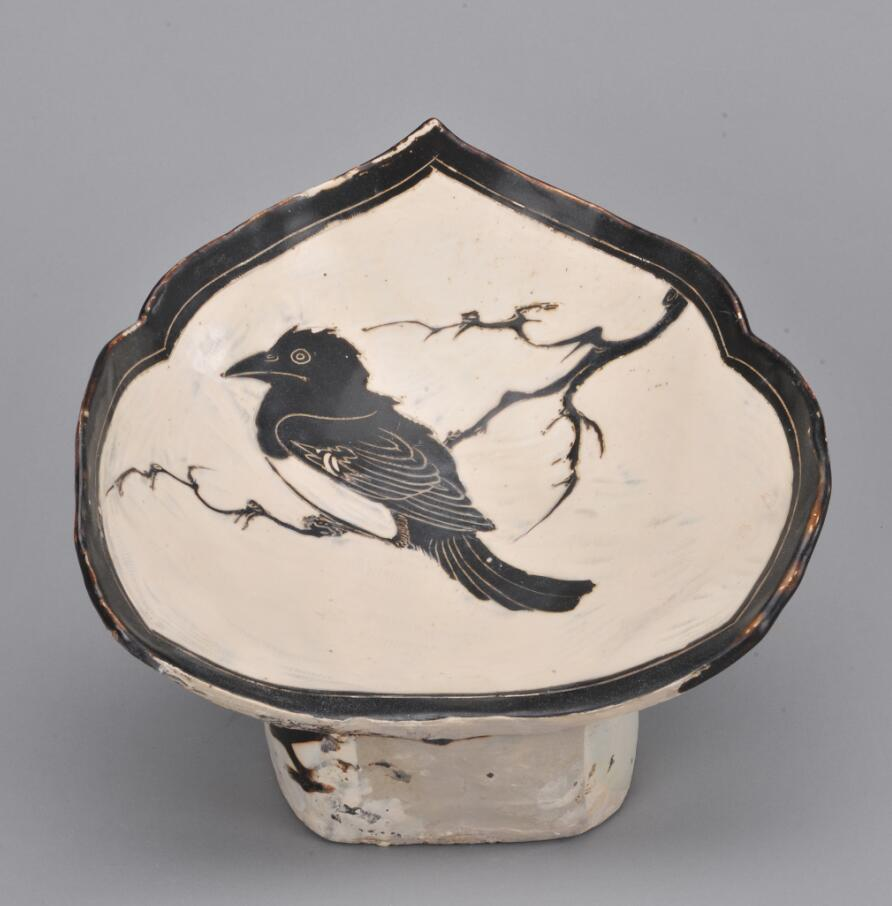 北宋当阳峪窑白地填黑剔鸟纹叶形瓷枕