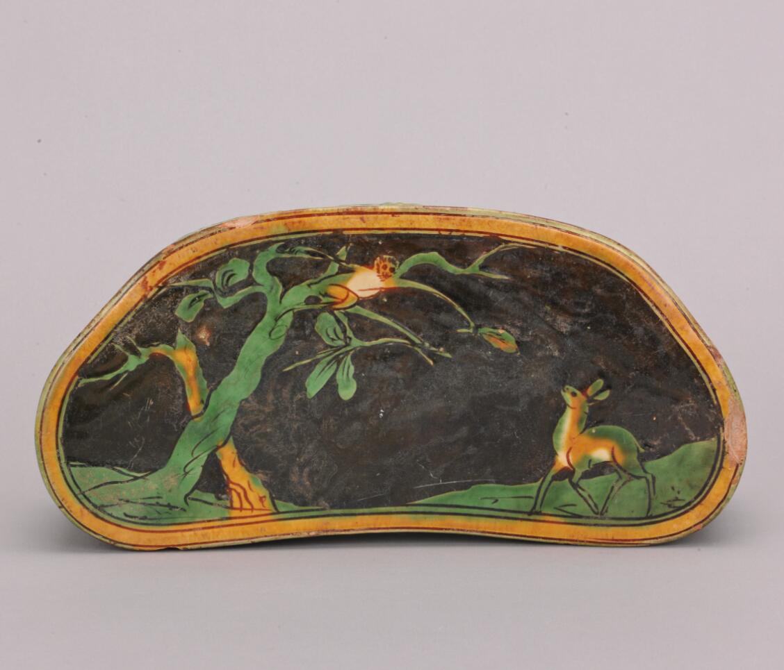 金晋南墨地三彩剔刻“晋官封侯”纹三瓣花形瓷枕