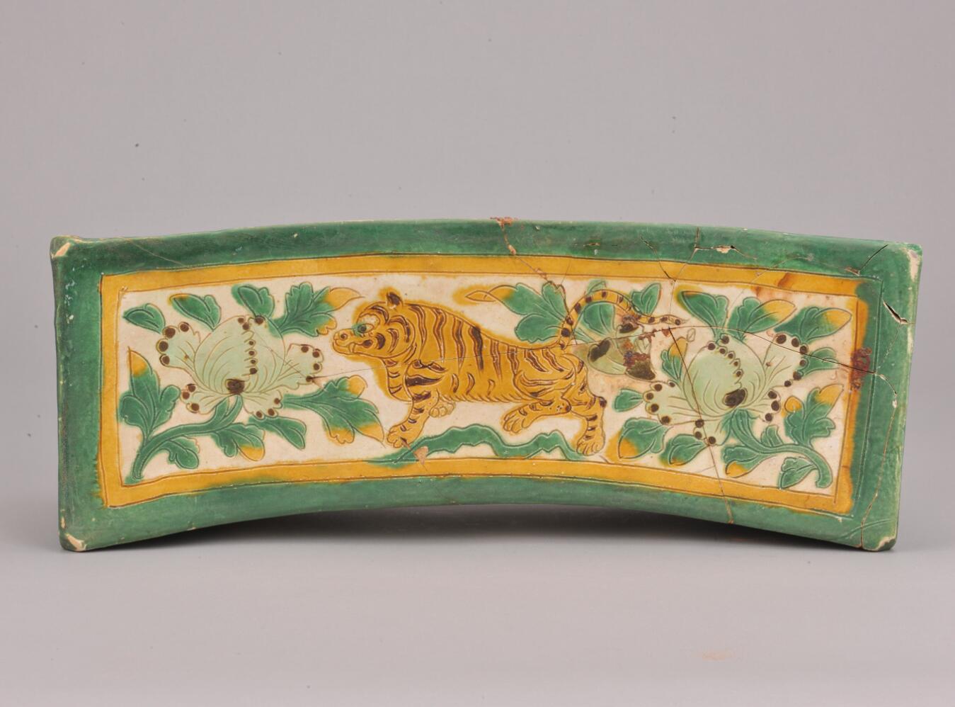 金三彩白地刻虎纹牡丹纹长方形陶枕