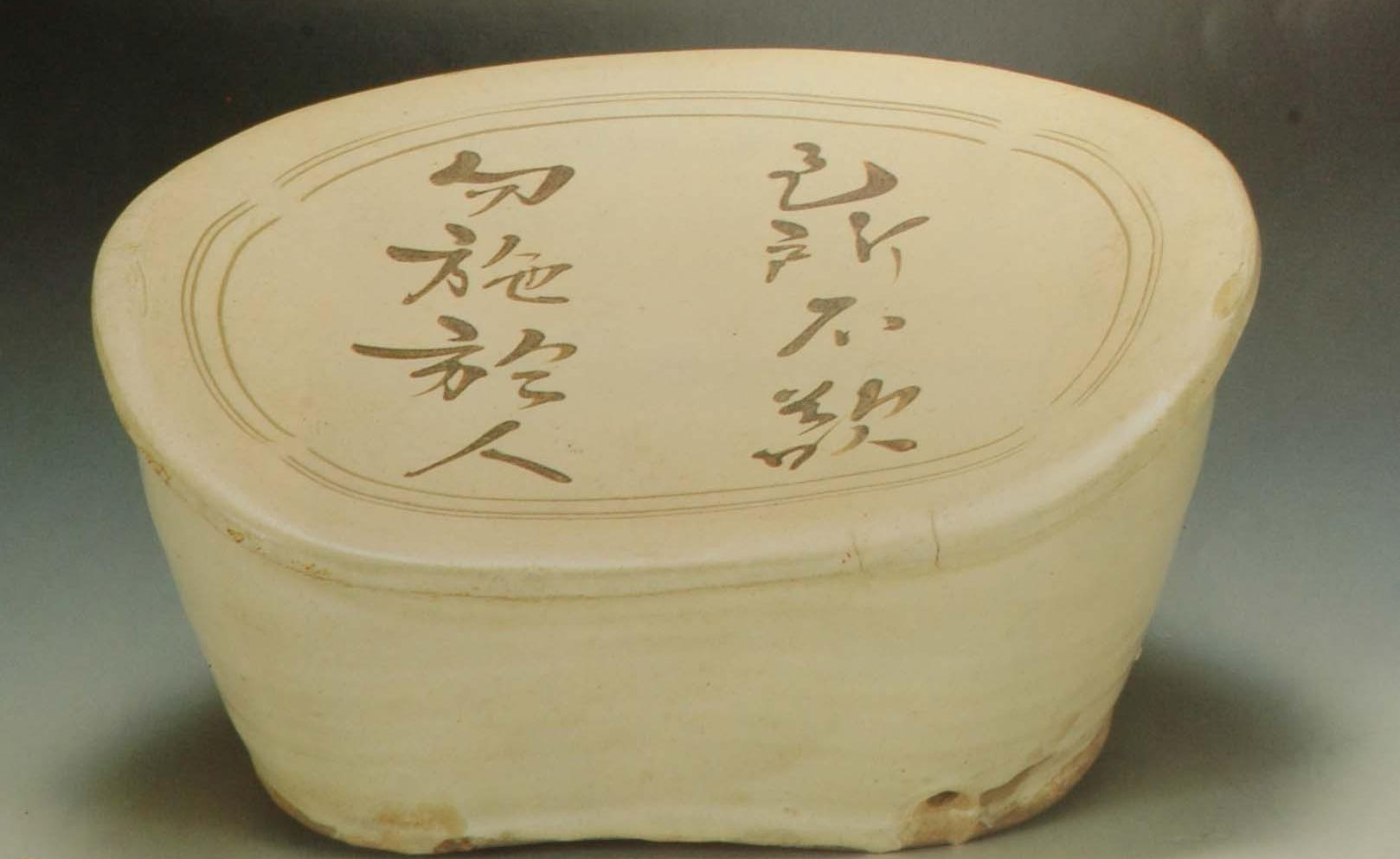 宋金辽时期的陶瓷枕文雅的很多,比如定窑“珍珠地划婴孩纹腰形枕”是珍珠地花纹枕中的佼佼者,也是定窑罕见的珍品。它在灰白色瓷胎上施以印花珍珠作地纹,在枕面中心划一丰腴肥满的婴孩,展示了高超的纹饰水平。金代“绿黄釉印花诗文扇形枕”,磁州窑产,刻有词一首:“帘卷夕阳曲槛明,东风桃李满画城,回首十年浑似梦,几飘零。花落渐随流水远,莺慵已许送春声,惟有西山还似旧,笑天青。——寄摊破浣溪沙。”这首词之前不见著录,可补《全宋词》之不足。