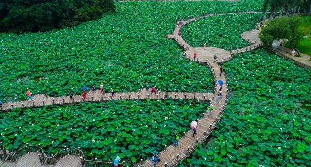 洪湖公园。洪湖公园的荷花很壮观,大片的荷塘无边无际,碧绿荷叶铺满湖面,青翠欲滴。记者在现场看到,荷花盛景虽然还没到来但荷塘中已经有不少的荷花长成了"豆蔻少女"。葱绿的荷叶衬托着粉嫩的花瓣,格外俏皮可爱。微风吹拂,花朵枝叶随之摇曳,阵阵幽香扑鼻而来,驱散了夏日的燥热。从洪湖公园北边到彩虹桥,一路上都是好风景,几个荷花池都有不同的景象。其中,位于公园正门东北方向的莲香湖有一条数百米长的湖中木质栈道深入荷塘深处。荷花盛开时,走上栈道置身于花海之中,湖中莲花触手可及。