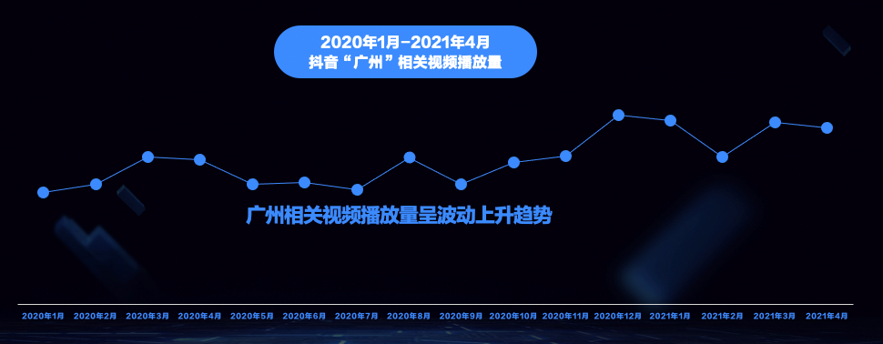 报告显示,2020年1月~2021年4月,广州相关视频在抖音播放量呈波动上升趋势,广州美好在抖音被人们看到。