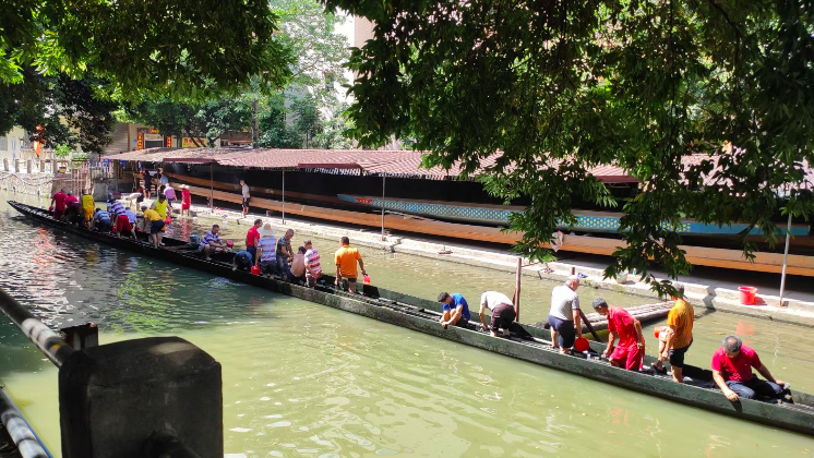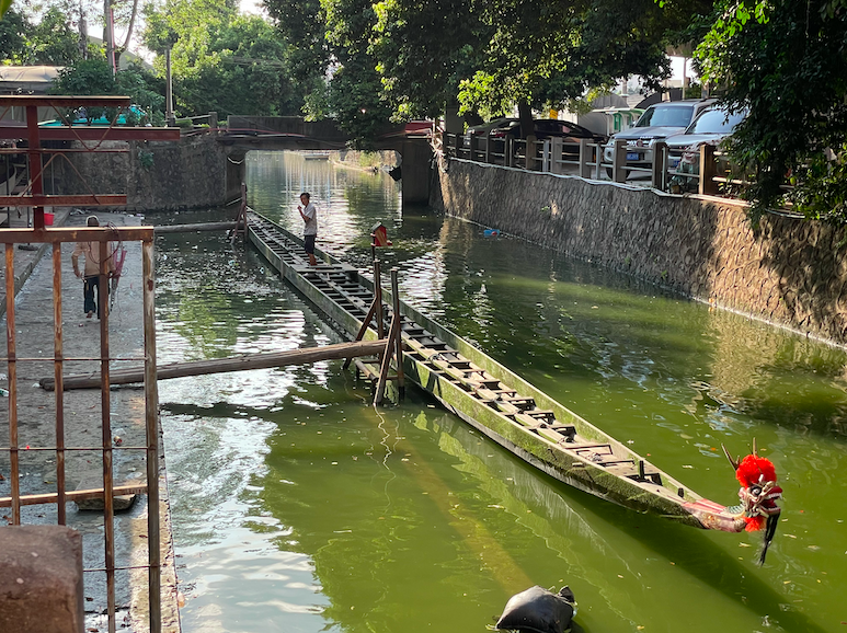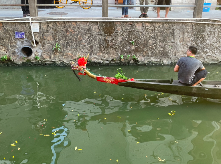 下午5点,听闻要采青,不少村民早已在西浦龙船坞旁等候,即将举行采青仪式的龙船就停靠在岸边。龙船头强哥告诉小e,这是刚从河道里“挖”起来的。经过村民长达数小时的洗刷后,龙船船身已变得十分干净,给人焕然一新的感觉。