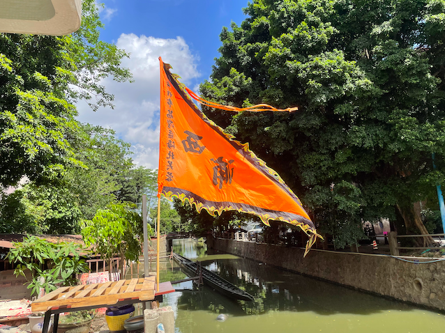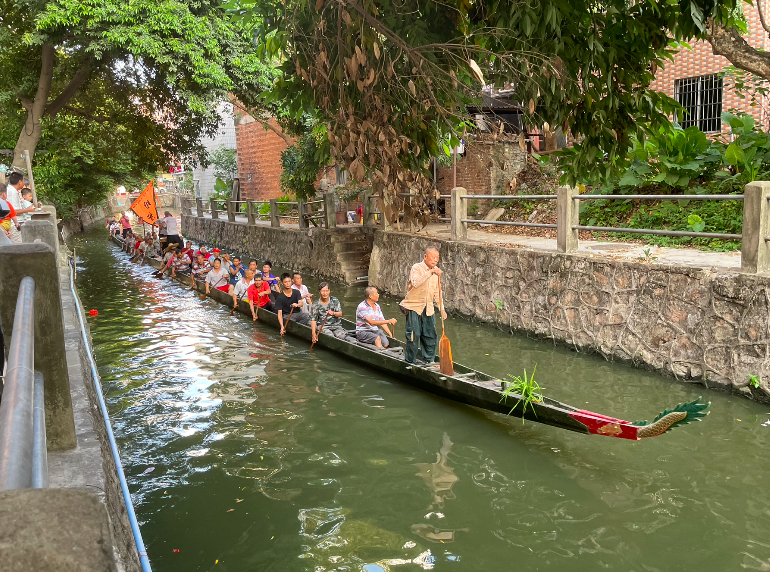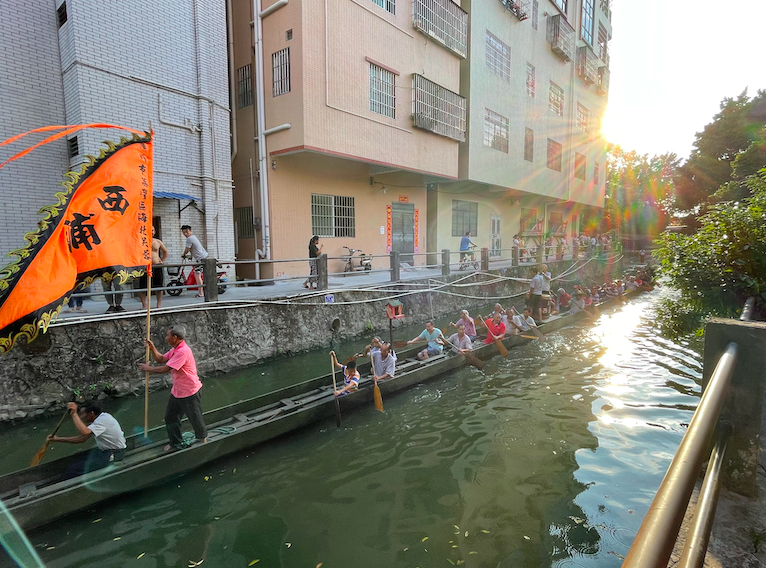 在众人的合力下,龙船沿着西浦涌缓缓向村口方向驶去,一位村民早已在岸上等候,为首的扒仔从其手上接过禾苗,分别插到船头和船尾,这时候就可以开始巡河了。