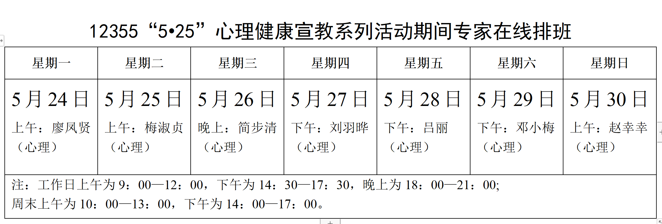 12355“5•25”心理健康宣教系列活动期间专家在线排班表