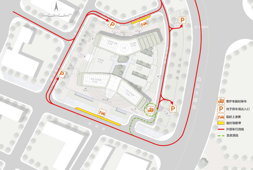 为满足医患的停车需求,拟在地下室设置2020个机动车停车位,4500个非机动车停车位,同时南北入口设置临时停车带。