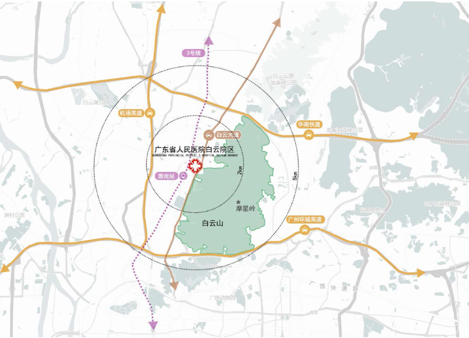 广东省人民医院白云院区项目为三级甲等医疗建筑,位于白云新城核心区地铁萧岗站东侧、蓝天新苑小区东南侧、黄石路南侧、白云大道西侧。距离地铁2号线(萧岗站)仅约 500米。