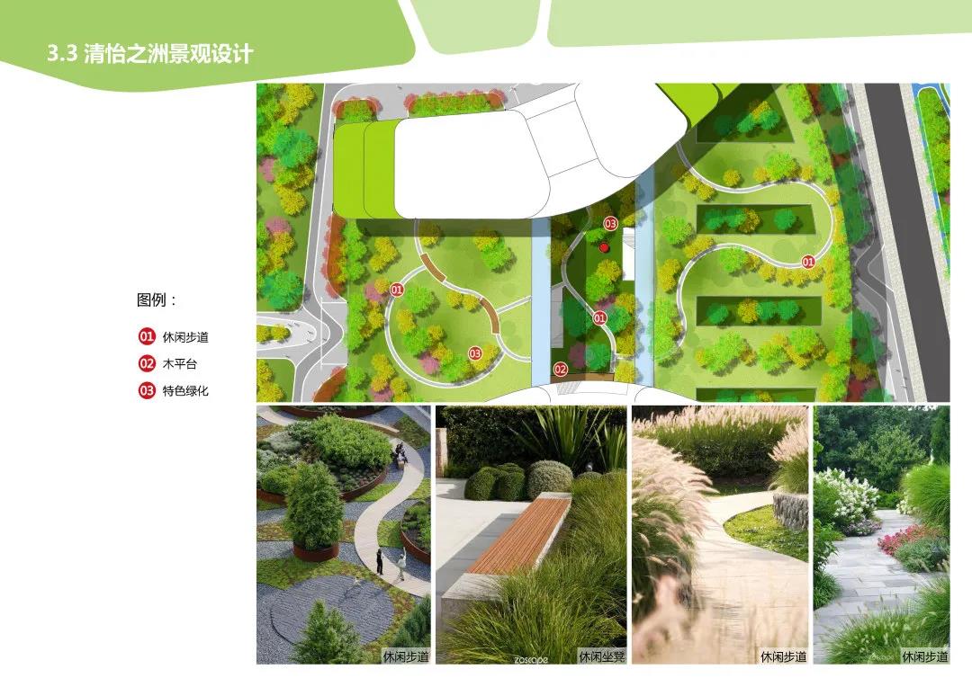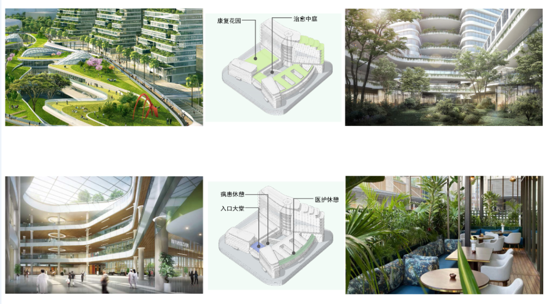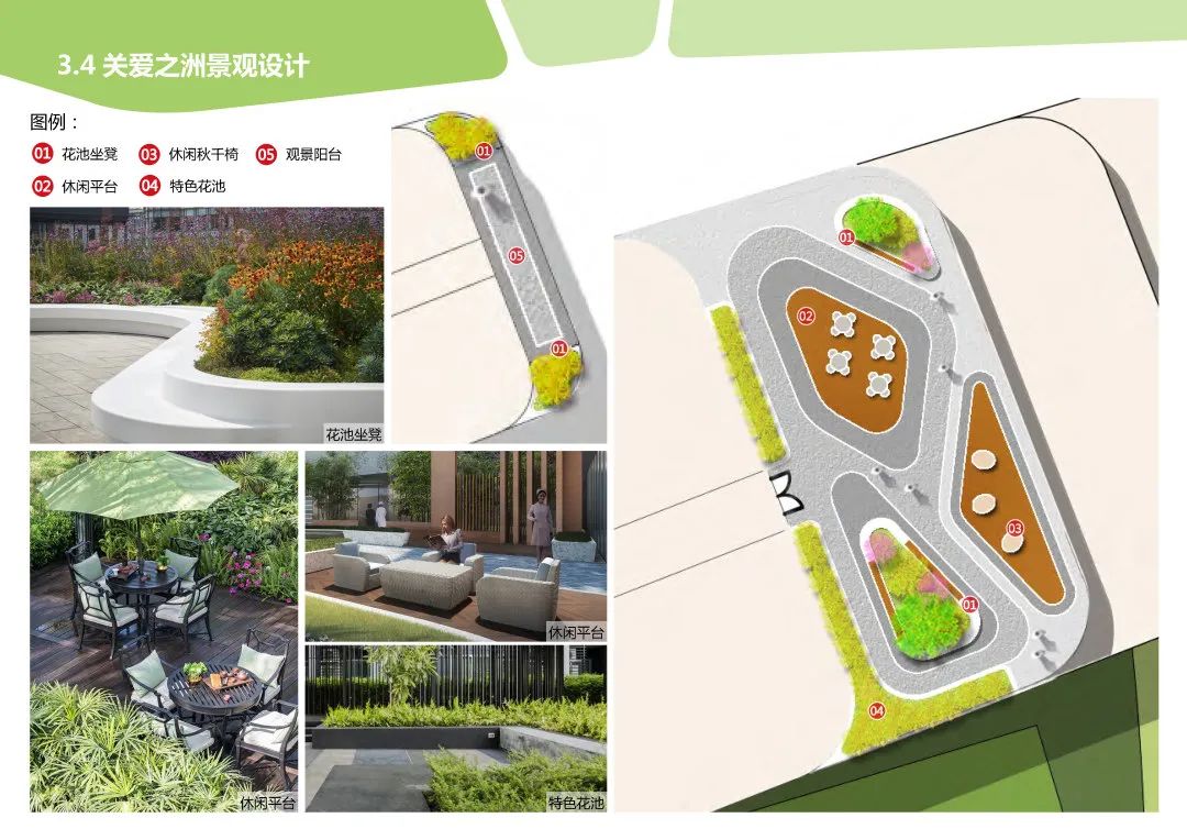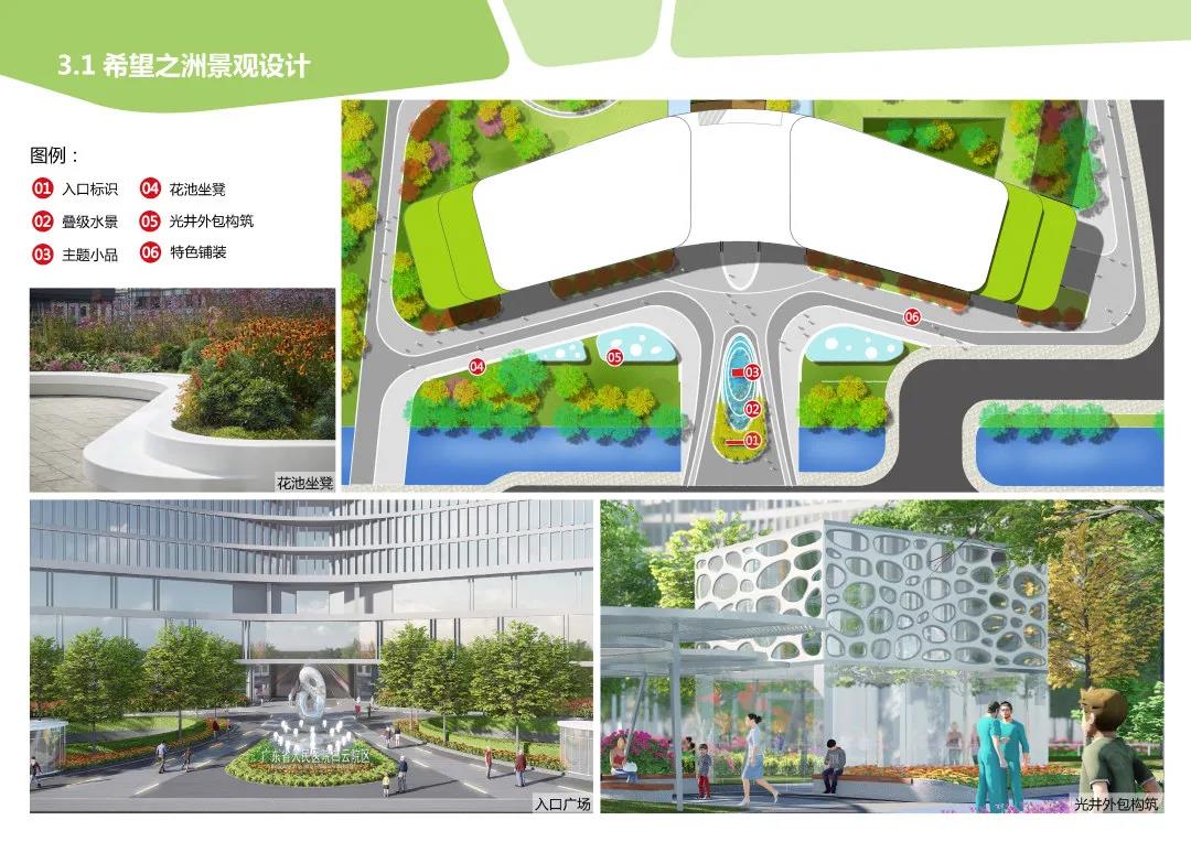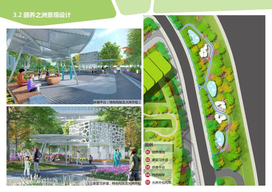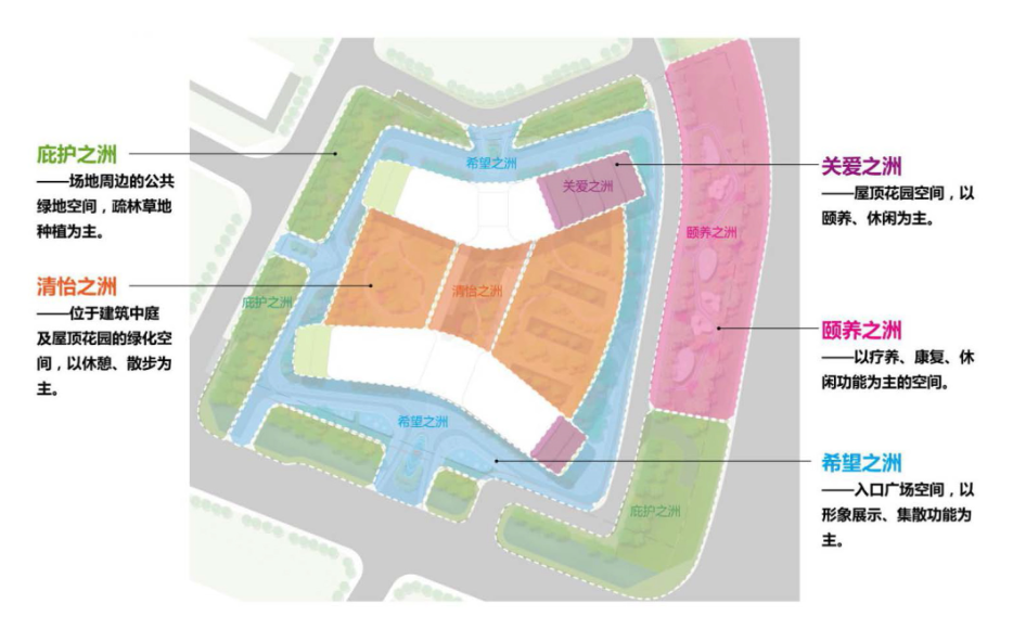 项目还拟打造一个具有疗养、康复、休闲、交流等功能的活动空间,为医患提供一个安抚、颐养、舒缓身心及缓解压力的场所。设计了五个景观功能区∶希望之洲、清怡之洲、颐养之洲、庇护之洲、关爱之洲。
