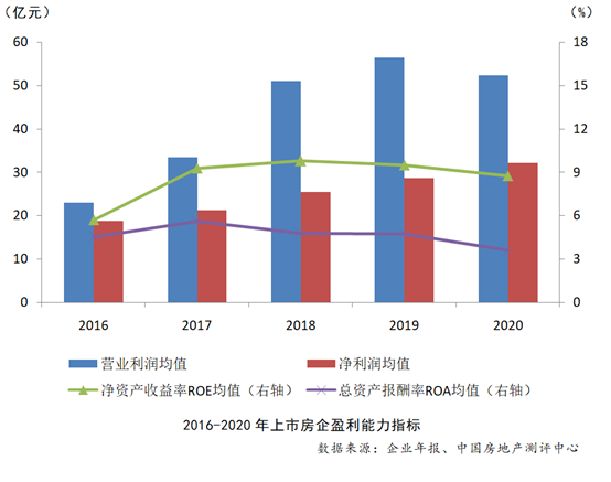 从核心测评指标来看,2020年上市房企规模持续增长,但增速放缓。总资产均值为1577.89亿元,房地产开发业务收入均值为274.96亿元;盈利能力方面,绝对指标净利润均值为32.17亿元,同比有所增长,但相对指标净资产收益率同比有所下滑;偿债能力有所提升,去杠杆效果显现,净负债率均值较上年下降0.7个百分点至95.07%;经营效率稳中有升,总资产周转率与上年基本持平,存货周转率稍有上升。