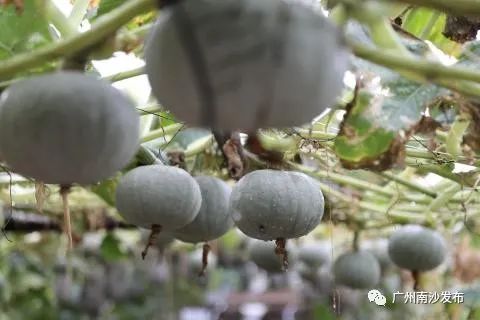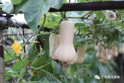 在展示田间,大小不一的丝瓜垂吊在藤蔓上,散发出香芋味道的南瓜惹人关注,还有长得形似葫芦的奶油南瓜挂在藤蔓上。