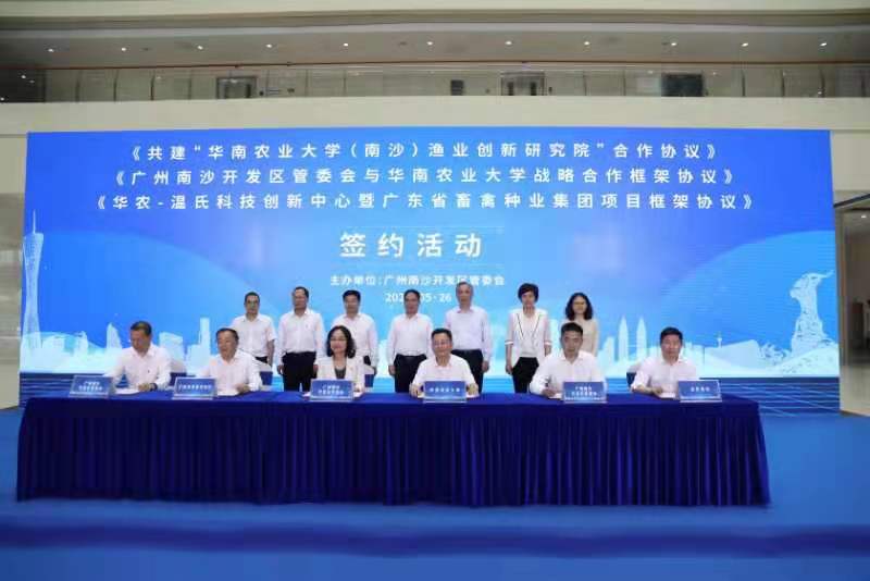 5月26日,广东省农业农村厅、华南农业大学、南沙开发区管委会、温氏集团系列合作签约活动在广州南沙举行。南沙开发区管委会与华南农业大学签署《战略合作框架协议》;与华南农业大学和广东省农业农村厅签署《共建“华南农业大学(南沙)渔业创新研究院”合作协议》;与华南农业大学和温氏集团签署《华农-温氏科技创新中心暨广东省畜禽种业集团项目框架协议》。