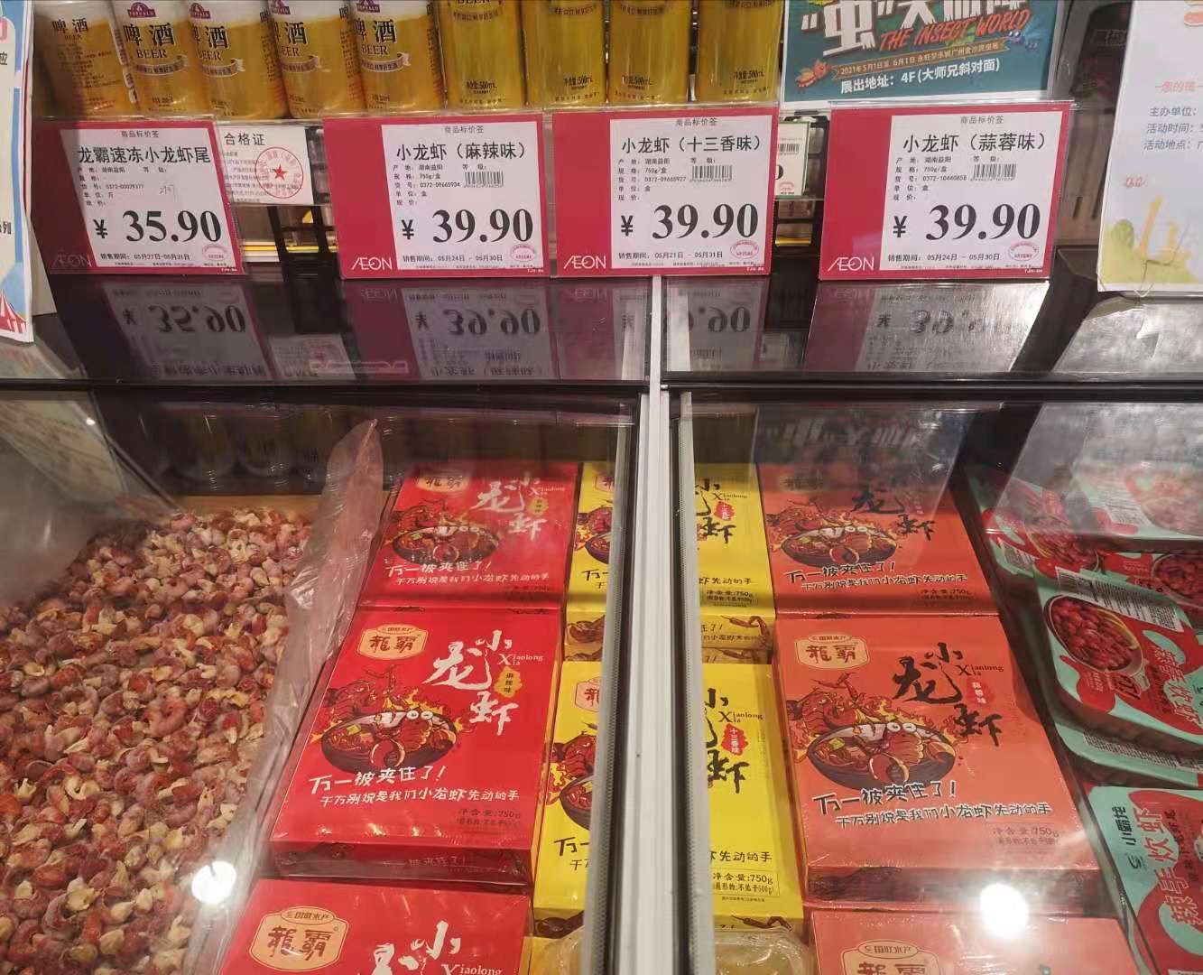 “湖北潜江地区小龙虾价格较高,18-20元/斤,湖南产地的小龙虾价格稍低,15-17元/斤,价格相比上月下降35%,与去年同期基本持平。”华润万家相关负责人表示。根据往年经验,4-5月小龙虾新上市期间价格相对比较高,到了6月价格会降到最低。现在小龙虾日均能卖近800斤,较上个月增加200斤左右,去年同期销量基本持平,活鲜小龙虾销量占比较高。不过今年海鲜类商品呈涨价趋势,罗氏虾和基围虾较去年价格上涨20%左右。