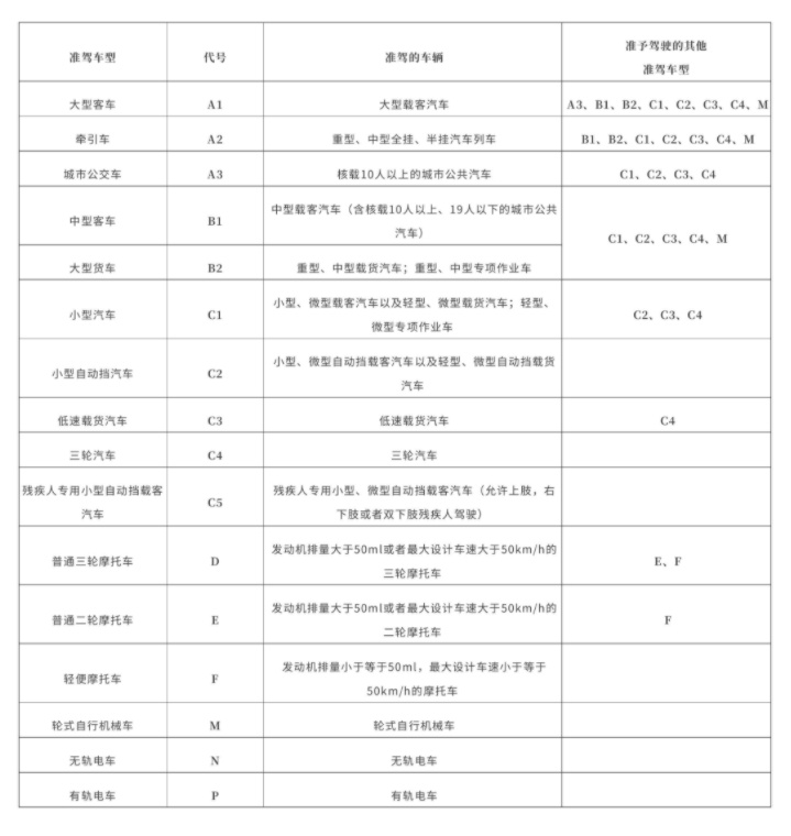 此外,我国的现行的驾驶证分为16类:A1驾驶证、A2驾驶证、A3驾驶证、B1驾驶证、B2驾驶证、C1驾驶证、C2驾驶证、C3驾驶证、C4驾驶证、C5驾驶证、D驾驶证、E驾驶证、F驾驶证、M驾驶证、N驾驶证、P驾驶证。