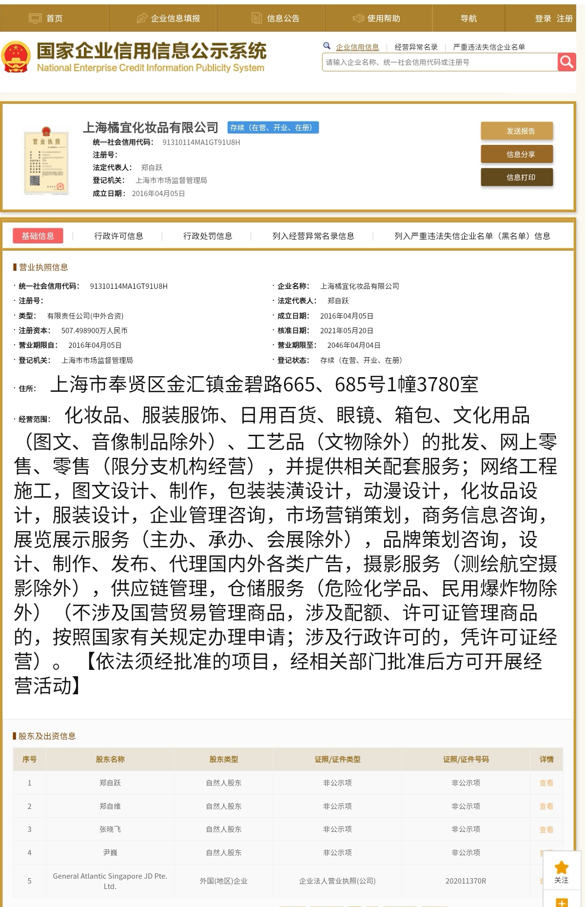 记者登录国家企业信用信息公示系统官方网站发现,上海橘宜注册资本已从133.865万增加至507.499万人民币。