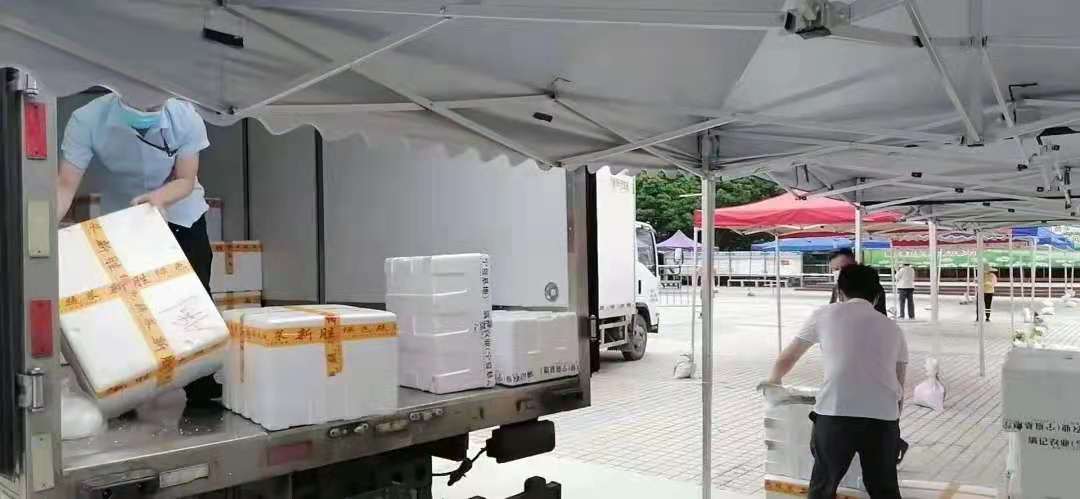 (在东漖街道临时供应点,风行生鲜为市民供货)