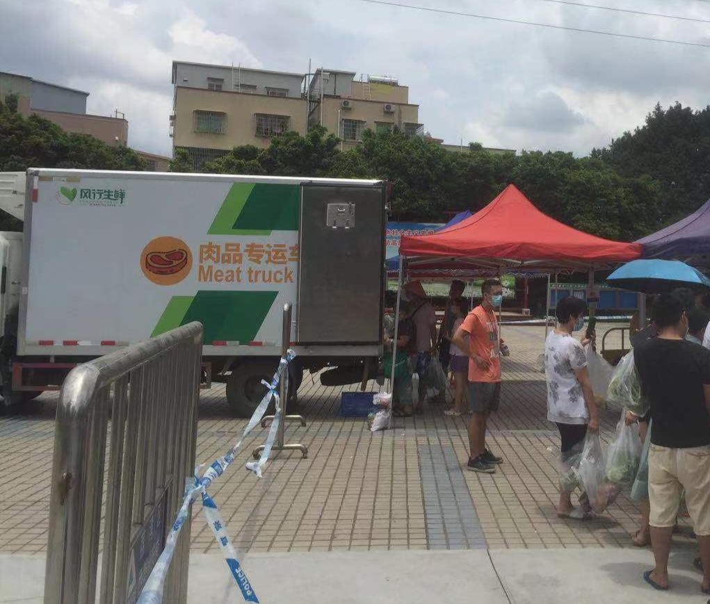 下属风行生鲜闻令而动,连夜组织调货和备货工作,5月29日一早便安排15台车辆和35名工作人员支持街道供应工作。当日,风行生鲜共在东漖街道设立6个应急供应点,组织肉制品2.5吨、蔬菜7吨,全部以采购价安排销售,并且随时安排物资补货,确保重点区域群众生活必需品供应。