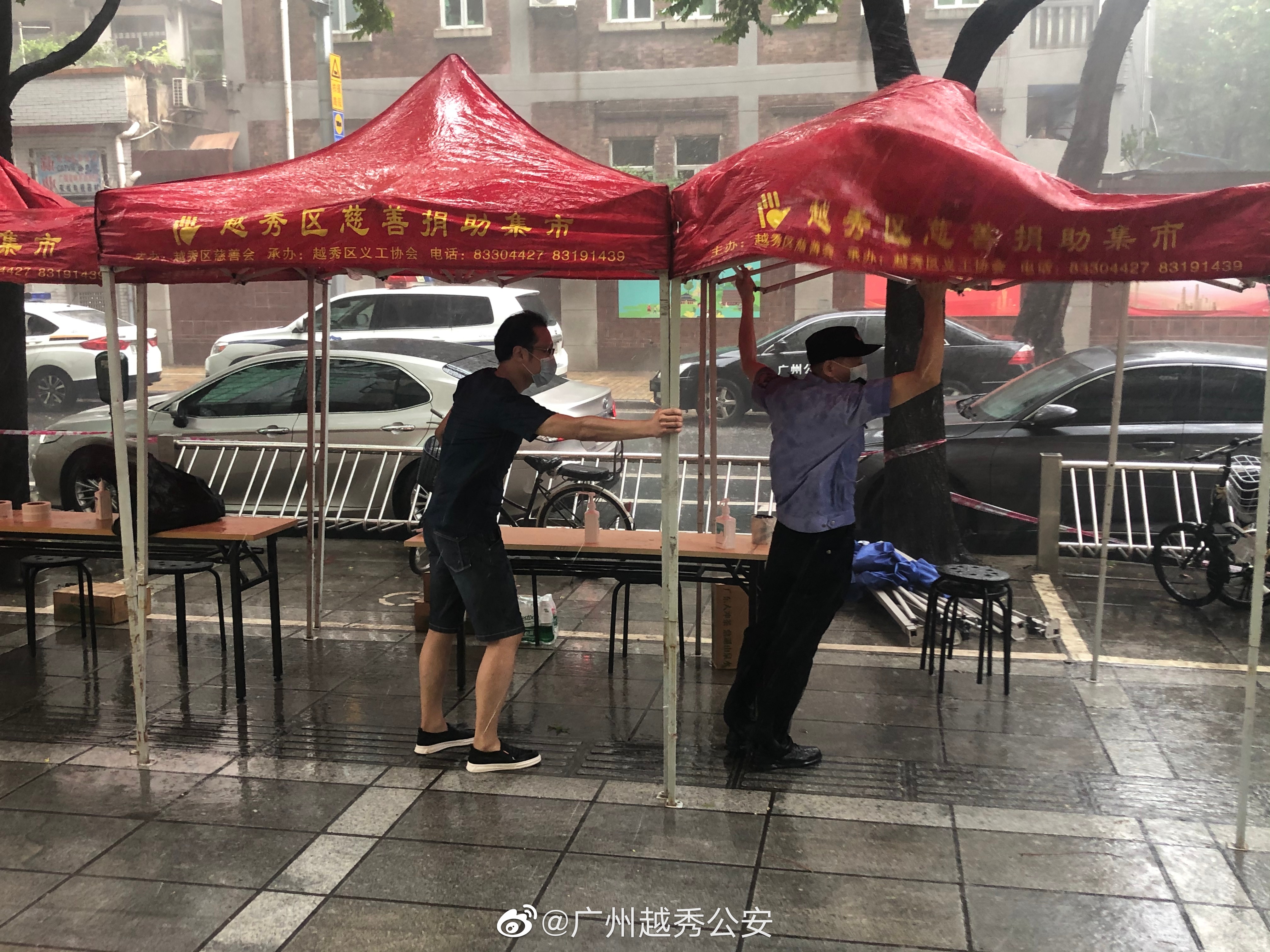 越秀区核酸监测点民警辅警和现场街道工作人员合力以身体护住雨棚