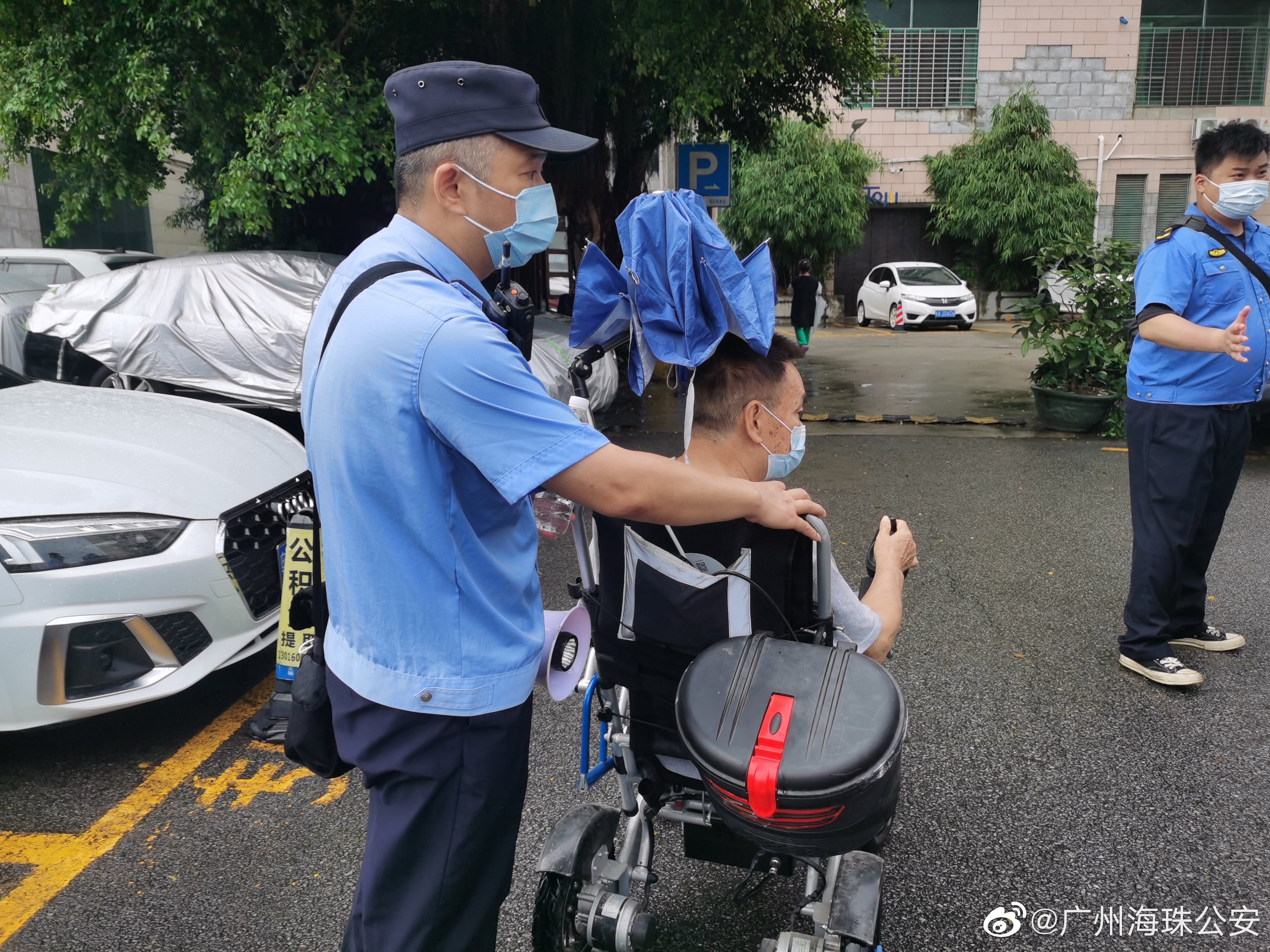 29日下午15时许,海珠区公安分局江南中派出所民警钱力戈推着一位坐着轮椅行动不便的居民来到街道接种疫苗。48岁的钱力戈从早上8时许开始一直工作到现在,他摸着湿透的警服笑着说:“也分不清是汗水还是雨水了。”说完,他又提着扩音器去维持秩序指引群众了。