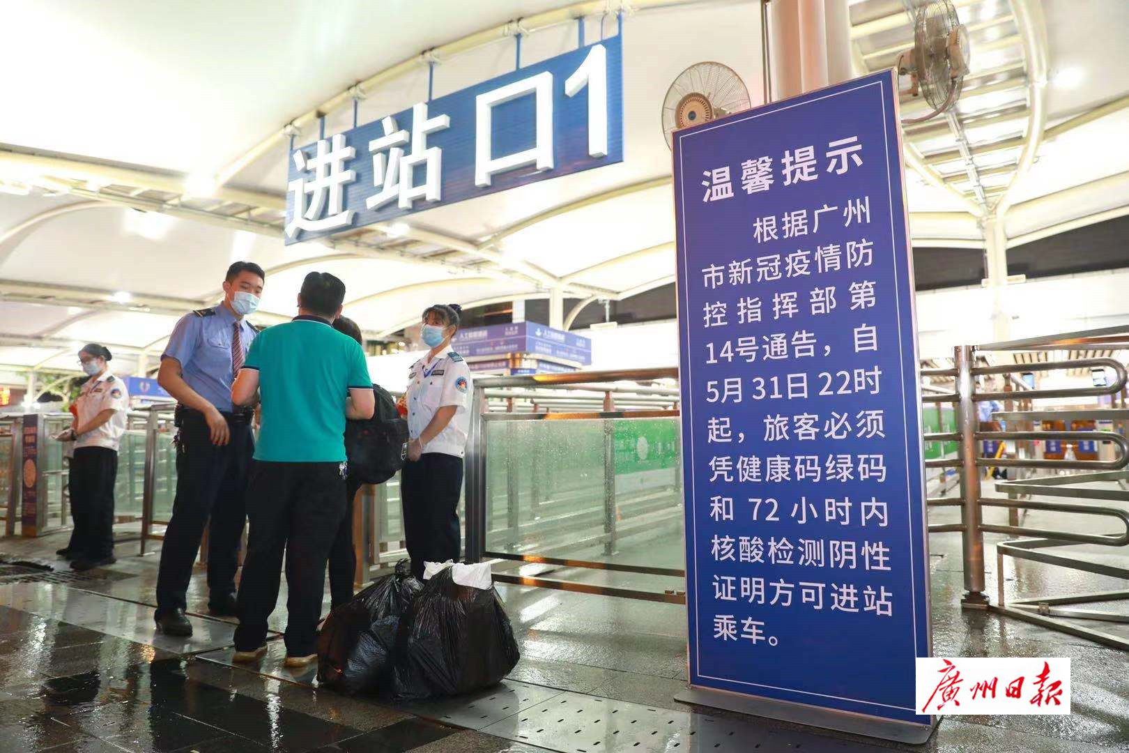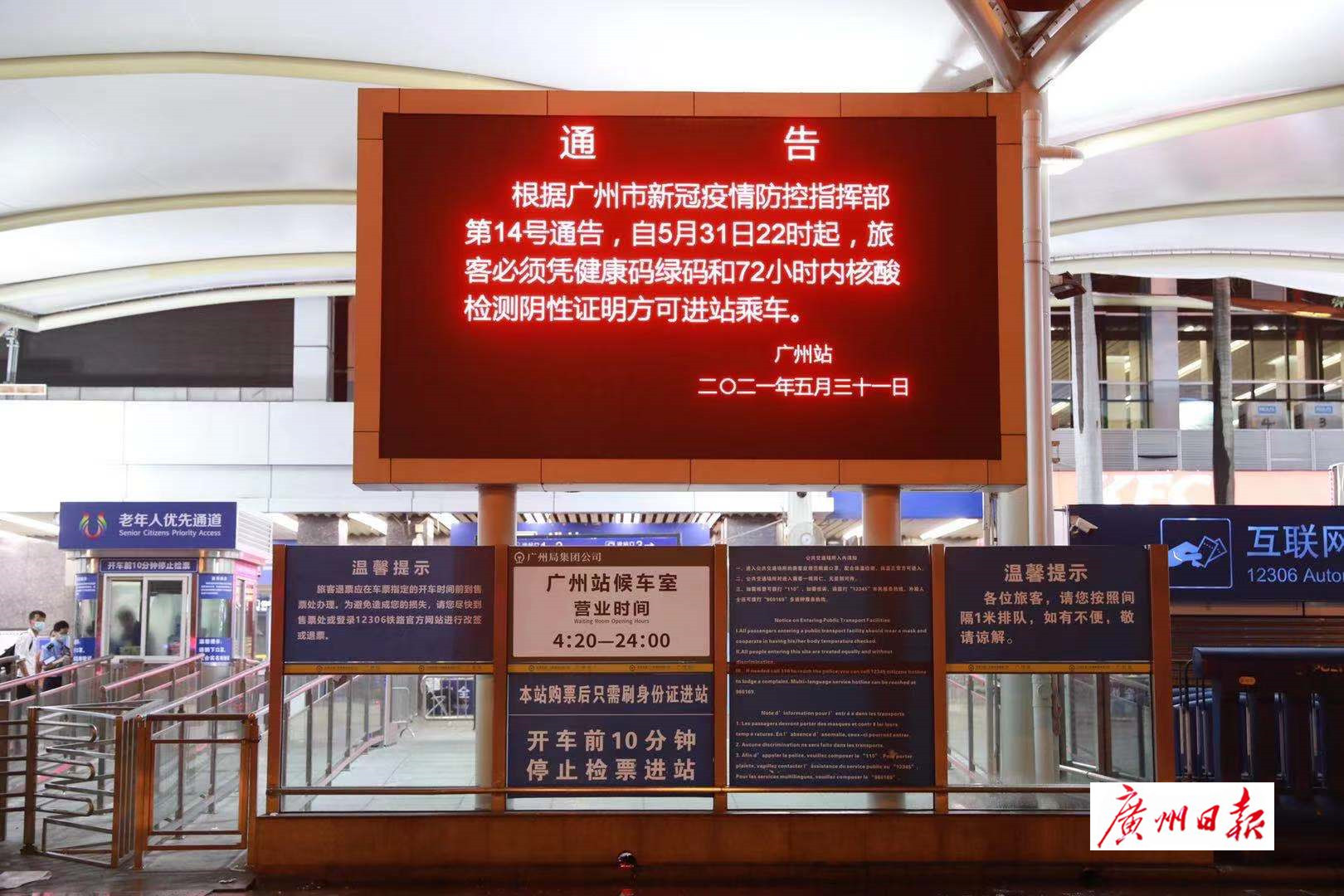 根据广州市最新部署要求,自5月31日22时起,旅客在广州地区各火车站(广州、广州东、广州南、广州北、新塘南、石牌、庆盛站)进站乘车时,必须出示健康码“绿码”和72小时内核酸检测阴性证明“紫码”,且体温不高于37.3℃。