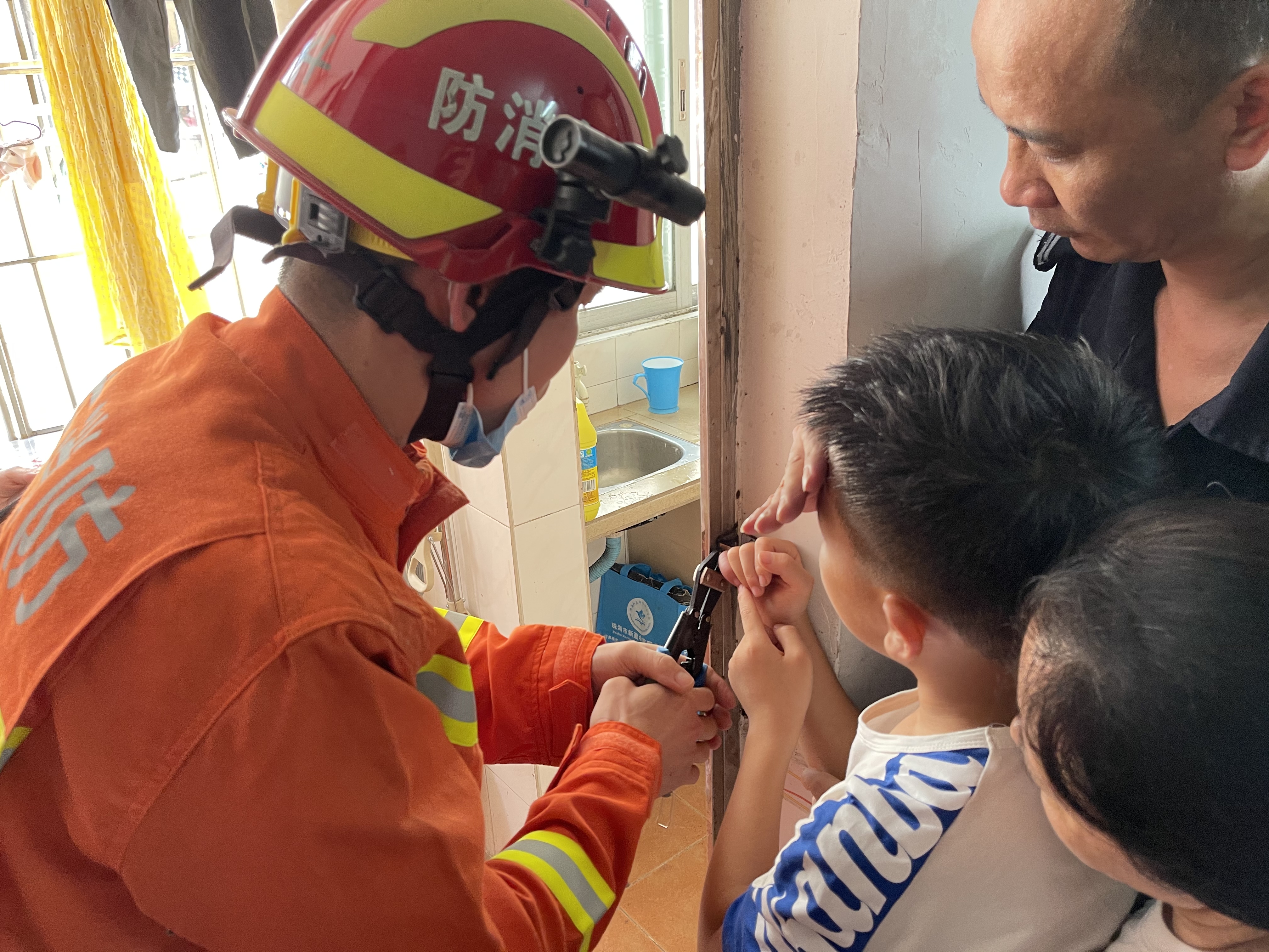 5月23日,广东茂名电城镇某美发店楼上,一名两岁的幼童被反锁在家中后哭泣不止,家人心急如焚却苦于无计可施。收到求助警情后,茂名市电城镇消防救援站消防员赶往现场营救。
